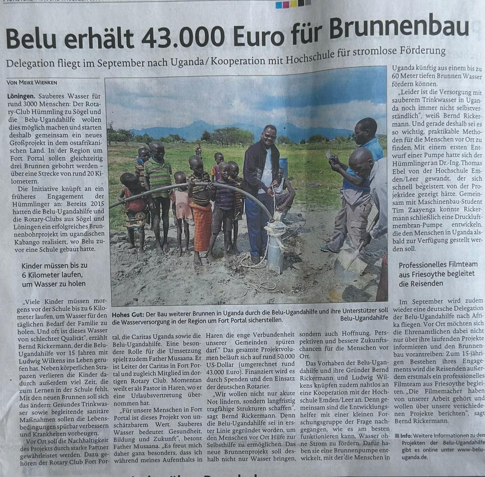 Sauberes Wasser für rund 3.000 Menschen: Der Rotary Club Hümmling zu Sögel und die Belu-Ugandahilfe starten gemeinsam ein neues Großprojekt in Uganda. In der Region um Fort Portal sollen gleichzeitig drei Brunnen gebohrt werden – über eine Strecke von rund 20 Kilometern.